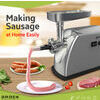 Stainless steel housing and square trayStainless steel blade Exchangeable 3 stainless steal cutting plates: 3mm, 5mm, 7mm Stainless steel cutter and vegetable cutter attachment with 3 cutters Accessories: sausage accessory, kibbe accessory, food pusher Reverse function Capacity: 2 kg/min Anti-slip feet Low noise: 85dB Power: 1400 W |